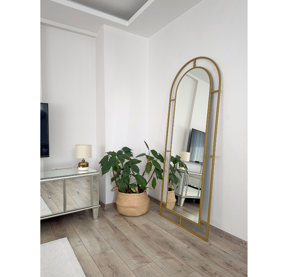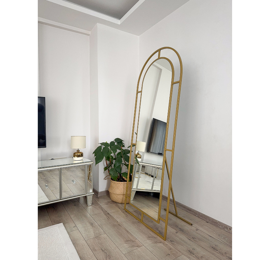 Modern tasarımıyla dikkat çeken Gold metal çerçeve, her türlü dekorasyona kolayca uyum sağlar.- 180x70 cm boyutlarındaki geniş yüzeyi ile geniş kullanım alanı sunar; makyaj yapmaktan günlük bakımınıza kadar tüm ihtiyaçlarınız için idealdir. Oval şekli sayesinde klasik ve şık bir görünüm sergilerken, ayakları sayesinde yerden tasarruf etmenizi sağlar.- Üretiminde kullanılan kaliteli malzemelerle uzun ömürlü kullanım vaat eder; dayanıklılığı ve estetiği bir arada sunar.- Yerli üretim geleneksel Türk zanaatının modern teknolojiyle buluştuğu bu ayna, hem kaliteyi hem de yerel kaynakları destekler. Kolay sökülebilir ayakları sayesinde duvara monte ve ayaklı olarak kullanıma uygundur . Temizliği hafif nemli bez ile yapılması ve kimyasal madde ile temas ettirilmemesi şeklinde önerilir .