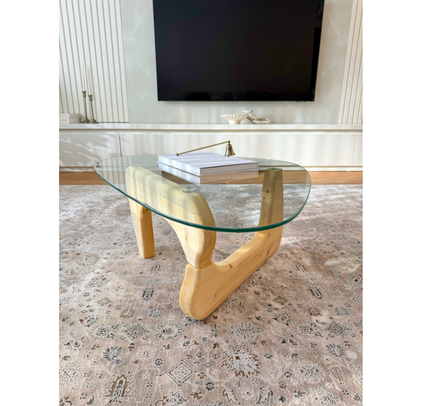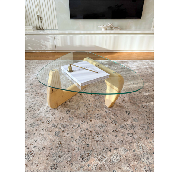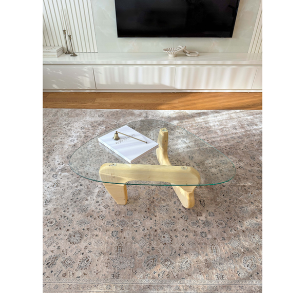 Evinize estetik bir dokunuş katmak için tasarlanan bu özel cam sehpa, minimal çizgileri ve zamansız tasarımıyla dikkat çekiyor. Asimetrik cam tablası ve heykelsi ahşap ayaklarıyla, salonunuza modern bir görünüm kazandırırken aynı zamanda fonksiyonelliği de ön planda tutar.